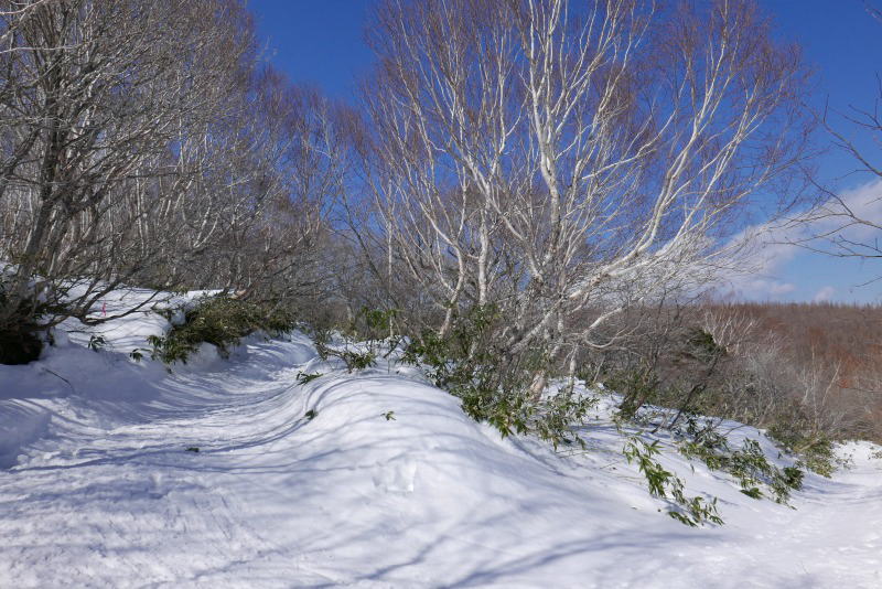 あだたら高原スキー場からくろがね小屋の間に2か所、急斜面を横切らなければならないところがありますが、そこで滑らない限り、楽しいハイキングコースです。ただし、吹雪かれれば侮ることのできない難しい道となることは、肝に銘じておくことではあります。