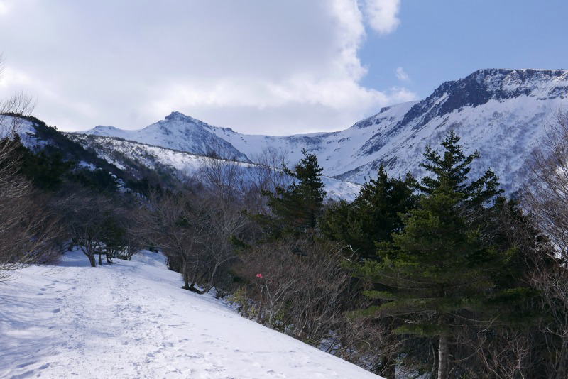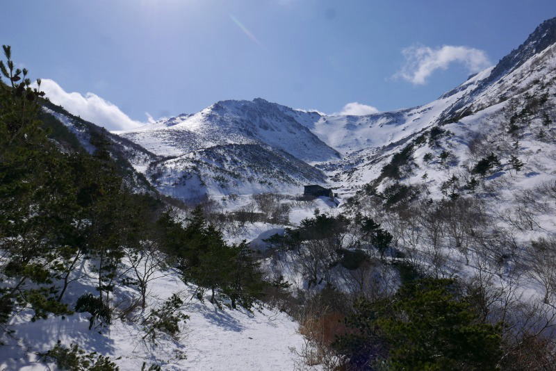 これまで、いずれも吹雪や強風で寒い時期に3回か4回くろがね小屋を訪れていますが、今回はほとんど秋の山の服装で歩くことができるほど暖かく、うっすらと汗をかくような陽気でした。とはいえ、気温はマイナスにはなっていて、予報では標高1,500mで−5℃でしたから、予報の風速12mの風は吹かなかったというだけのことだったのかもしれません。