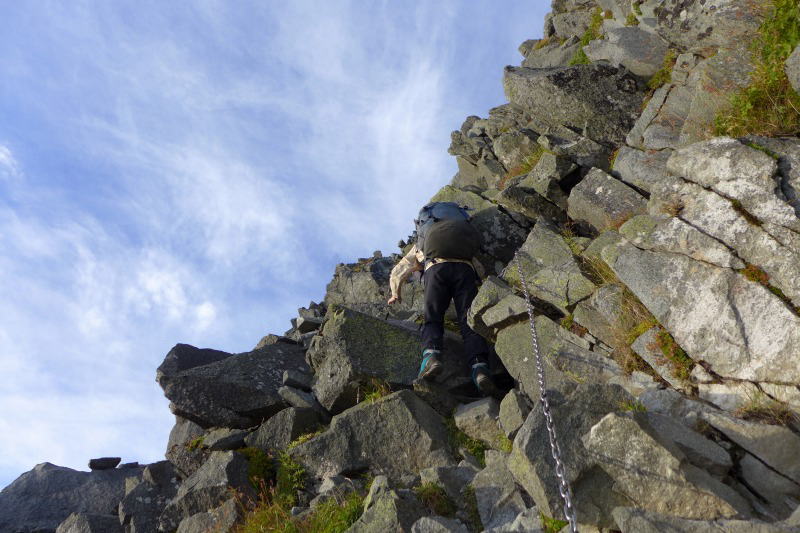 南岳小屋へ至る今回のルート上の最後の岩場は長かった。ルンゼ状の登りに梯子や鎖が設置されているものの、長丁場を歩いてきた体には辛かった。しかし、そんなことを言っては、最後の登り付近で登山道を整備して下さっていた作業員の方には失礼というものだろう。こちらは遊びで来ているのである。挨拶をして横を通ると「ご迷惑ですいません。」をあいさつを交わしてくれる。本当にありがとうございます。