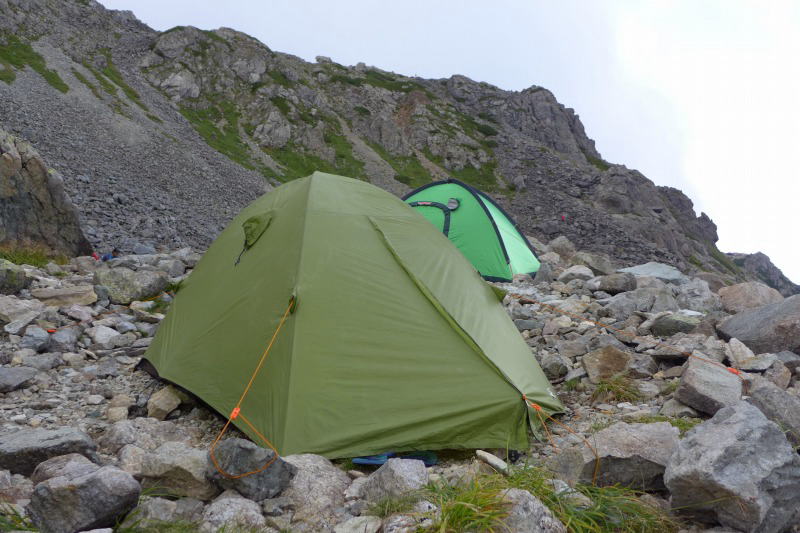 比較的地面が整えられたテント場を確保して、マイホームを設営し、小屋の冷え冷えビールを堪能する。槍の稜線を見上げるとまだ槍の頂上を目指す人が数珠つなぎである。今回も当初から槍ヶ岳のテント場は当てにしていなかったが、殺生ヒュッテもこのように大混雑とは。昨今のテントブームは恐ろしいことになっている。どうぞ、このテント群の中からほんの少しの人でいいから日高山脈のテント場に行ってくれないだろうかな。