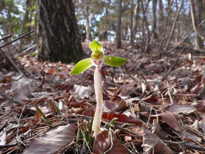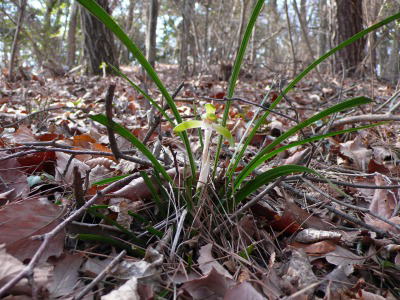 カタクリやアズマイチゲの開花をここで待つのも無聊なので、山の中央部にある「かたくりの園」のかたくりを見るために青龍ヶ岳を越える。すれ違う人も多いが、早朝のハイカーは皆明るいあいさつを交わしながら通り過ぎていく。いつもの習性で花は咲いていないかと目を遠くに近くに移しながら歩いていると、春蘭が咲いている。カタクリには心を動かされなかったが、春蘭の自生を見るのが始めてであったことから、急にワクワクした気分になった。その花を間近に見るためには1〜2歩道を外れて落ち葉を踏まなければならないが、落ち葉に乱れはない。これほど多くの人が通るハイキングコースのそばなのに、皆、気付かないでいるのだろう。その後注意して見ると、ある特徴的な場所になると数株づつ見つけることができる。これらのうち踏む跡が確認されたのは1株だけであった。