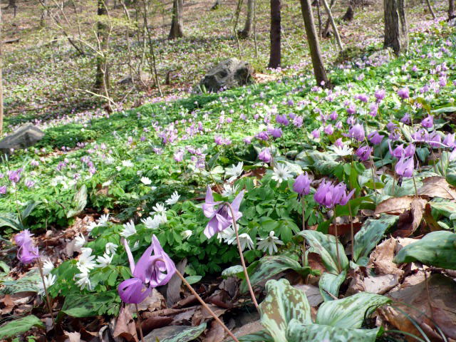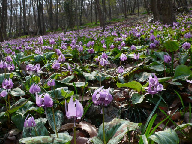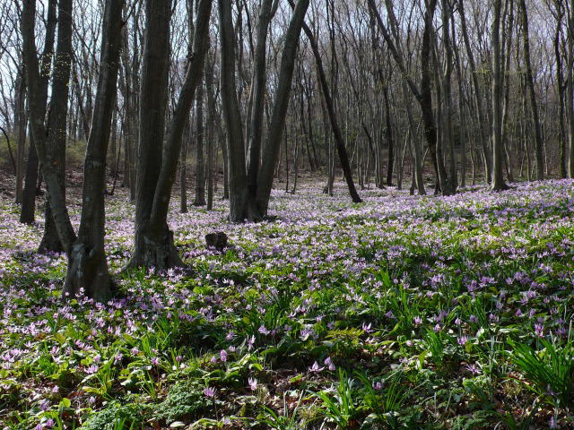 カタクリが咲く場所は、「かたくりの里管理センター」から5分ほどの北向きの谷合にある。まだ陽の光を十分に浴びていないので、カタクリもアズマイチゲも花びらを閉じたままだが、山肌を覆うようにカタクリが生えている。では、その感動の度合いと言えば、北海道で初めてカタクリの群落を見たときの驚きには程遠い。それは旭川の突哨山(男山)のカタクリで、その規模は他を圧倒するほか、エゾエンゴサク、キバナノアマナ、フクジュソウなどの春の花との競艶が実に見事である。