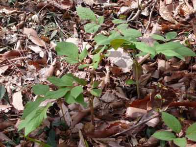 とある場所に差し掛かると、おやっと思う葉が目に付いた。葉や茎は赤身がかっている。もしかするとベニバナヤマシャクヤクではないだろうとも思ったが、花の色は白いようだ。数年前に、札幌近郊で、偶然に、そして初めてヤマシャクヤクを見付けたときの驚きは今でも忘れることができない。三毳山でこれがその優雅な花を付けたときには誰もが、ヤマシャクヤクであることを認識できるだろうが、そのころはカタクリ協奏曲の騒ぎはとっくに収まっていて、この花が咲くころには訪れる人も少ないだろう。その花が咲くころにもう一度三毳山に行ってみたい。