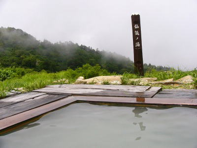 蓮華温泉は,山の中腹に登るごとに温泉が湧き出ていて,仙気の湯には平岩駅からのカップルが入っている。その上の薬師の湯は家族が入っていていったん黄金の湯に向かうが,岩だらけの道は沢に向かっていてサンダル履きでは厳しく元に戻ると,カップルはすでに着替えていて譲ってくれる。