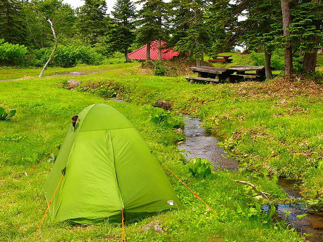 湧水が流れとなる場所にテントを張る。こんこんと湧き出る水は指先が切れそうな冷たさで,長く手を入れられない。