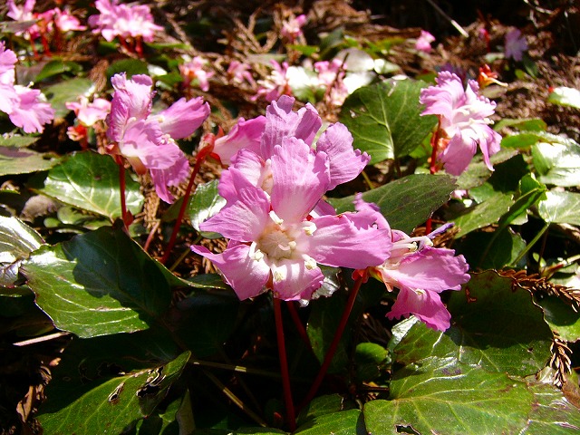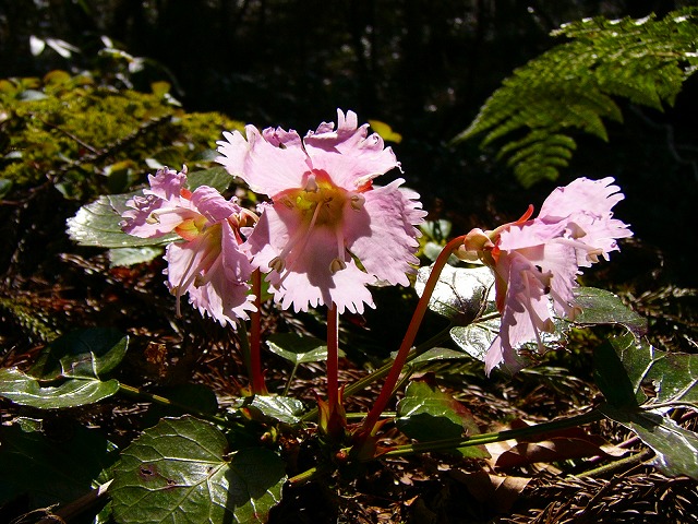 季節はすでに初夏の様子で,取り付きから急登の東仙コースでは,なまった体の辛さもあって汗が吹出す。ほんの少ししか進んでいないのに休憩を繰り返しつつ行くと,イワウチワが顔を出す。