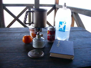 頂上は,1201m,最高点,三角点と3つのピークをつないでいて,ササや低木が生えているだけのだらだらとした地形で,これといった特徴を持たない。稜線に強風が吹き付けていることから,このまま下りてイワウチワを見ても,写真には収めることができないだろうと,西仙分岐に建つ休憩舎に入って風が収まるのを待つこととした。休憩舎は四囲すべてに壁があるものではないが,ちょうど風を避けることができる場所があったので,しばらく寝転んで本を読みながら過ごす。