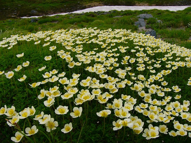 カールから稜線に登る道は急斜面の上浮石が多くて険しく,まだ目覚めていない早朝の体には辛い。ウサギギクやミヤマキンバイの黄色,ミヤマアズマギクのウスムラサキ色の花など,早朝の雨に濡れた鮮やかな高山植物を見やりながらゆっくりと稜線への道をたどる。稜線に出て,ザックを下して休憩する。脂肪を燃やしエネルギーとするには,炭水化物の摂取が欠かせないことから,食欲のない胃に朝食のパンを押し込むようにして流す。(05:50)