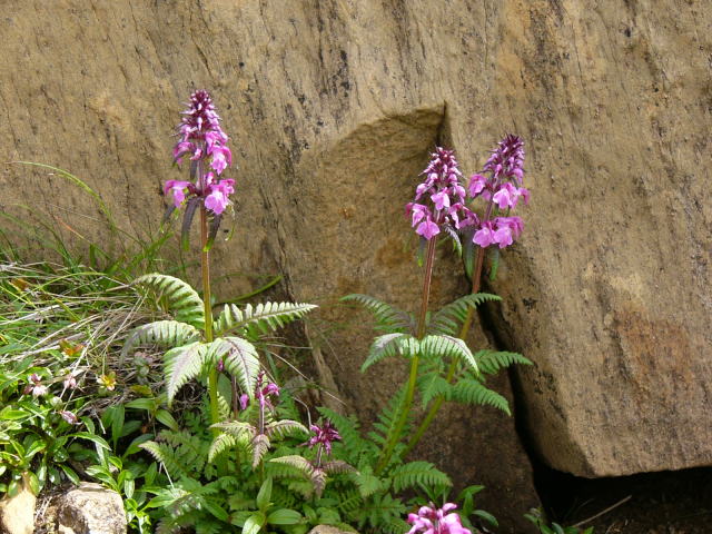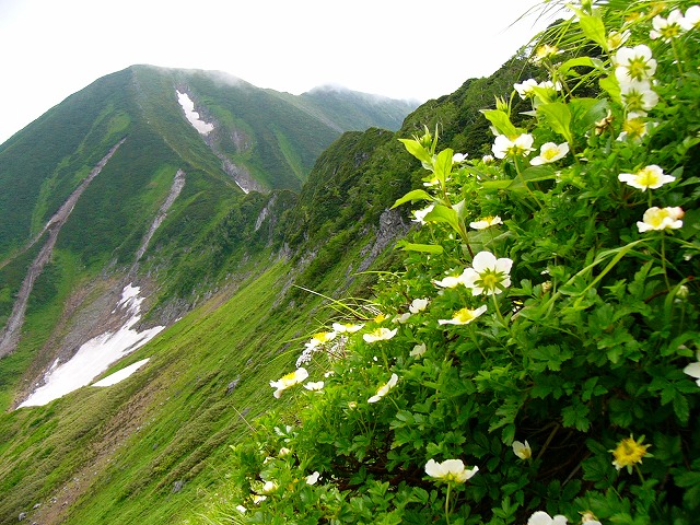 水場のコルからは緩やかながら登りとなり,最初のコブに立つと伏美岳までの道のりは遠い。伏美岳の頂上の手前で道が2本に分かれ,一方は急な岩場を登る道となるが,これが妙敷山へ別ける道と勘違いし,様子を見に行くが,先は岩とハイマツを分けていかなければならないことから,元の道に戻って,ザックを下したついでに朝食を摂る。伏美岳の頂上は,休憩地点からわずかなところにあって,人はいない。先を急ぐため頂上から下りるとハイマツの先に黄色いテントが見える。(08:00)停滞しているようで,人が動いている気配はないが,声をかけると,男性2人が顔を見せる。話を聞くと1967峰を往復したいが,天候が悪いので食事も摂らず様子を見ているという。