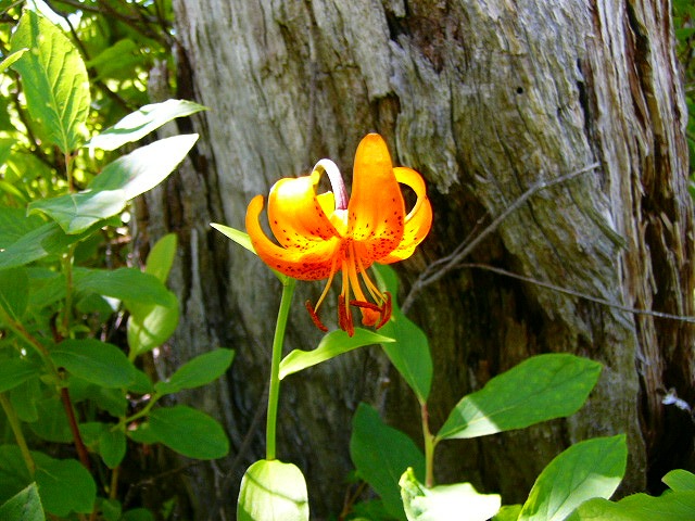 里の天候がよいものと見え,次々に登ってくる人と会うようになる。最後に会ったのは,縦走装備の若い女性2人で,「始めてテントに泊まるのですけど,注意することはありますか。クマは出ましたか。食料は気の枝につるしておくのですよね。」と聞く。クマもいなければ天候も回復し人も多く入っており,テント泊になんの心配もないからゆっくり楽しんできなさいと答えると,「安心しましたぁ〜,楽しんできます。」と言って明るい返事を残して登って行く。中高年の登山ブームの中,若い人が登山道にも見られるようになってたのもしい。クルマユリが満開となった急な傾斜の雨上がりのぬかるんだ登山道を,何度か滑りながら順調に下り,すっかり晴天となった登山口に無事着いて,ぐしゃぐしゃとなったすべてを脱いで着替え,大きく一息ついた。(10:00)この長丁場の縦走では耐えに耐え歩いたが,往路の日高の素晴らしい山並の展望を楽しむとともに,体脂肪の激減(22%→15%)という副産物がもたらされた。