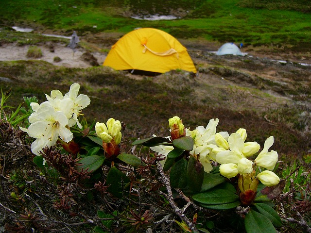 キバナシャクナゲ咲く七ツ沼カールのテン場