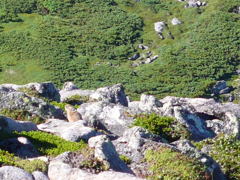 北見からみえたと言う単独の、ベテランとお見受けする爽やかな女性が、ナキウサギが顔を出しているところを教えてくれる。この山の岩場では、どこからでもナキウサギの「ピチィ、ピチィ」という鳴き声が聞こえる。