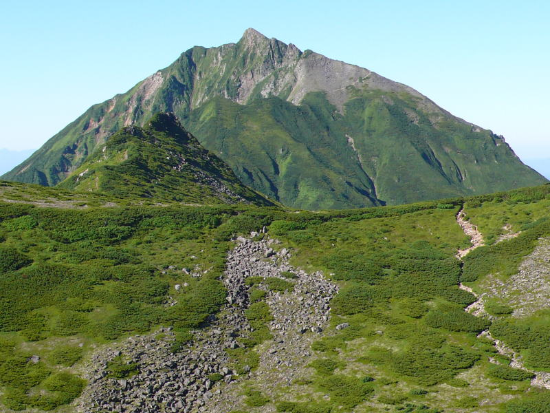エゾマツでうっそうとして暗く、ぬかるんだ登山道を黙々と歩く。小天狗で左に折れて前天狗とのコルに出ると、テントが一張り置かれている。両サイドが笹で覆われている歩き辛い登山道を進み、ダケカンバ、ミヤマハンノキ、ハイマツなどの中をくぐって前天狗に出ると、ニペソツ山が「どど〜ん」と眼前に現れ、圧倒的な存在感を見せ付けられる。この衝撃は、北アルプス五竜岳を登って以来のものだ。