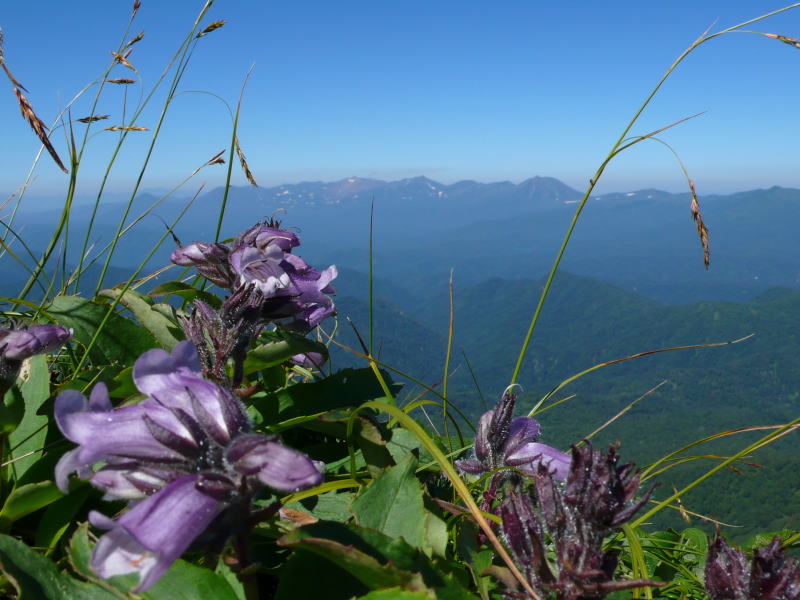 登山道では、これと言った花は見かけなかったが、頂上には10種類以上もの花が咲き誇っている。しかし、スガワラビランジとの対面は叶わなかった。心地よい風が吹いてくる。太陽の直射があっても暑さを感じさせない。ゴツゴツした岩に体を合わせ横になるとすっかり休憩モードになって1時間も寝てしまう。このような幸福感は、夕張岳の頂上での惰眠以来である。