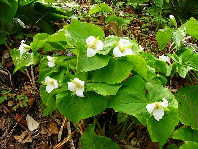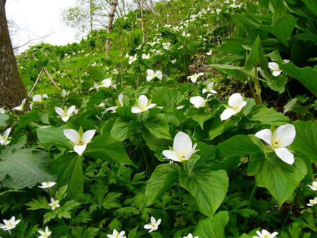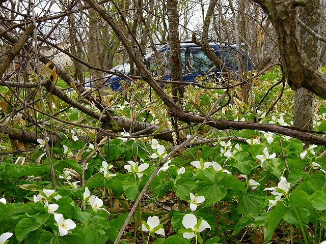 えりも周辺を逸脱し,浦河町に戻って山中に入るとオオバナノエンレイソウが林道の両脇に驚くほど大きな花を付けている。ニリンソウやカタクリに囲まれて君臨するオオバナノエンレイソウには,白い貴婦人といった称号が似合うのかもしれない。