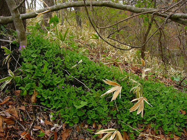 サクラソウ科の花,リベンジの旅初日ではあるが,さっそく目についたエゾノリュウキンカの大群落の中に入っていく。ここは林道を少し入った清流に沿って長くエゾノリュウキンカの花の道が続く。笹の葉の下に隠れるようにしてオクエゾサイシンが花を咲かせているが,ここで取り上げるべきはギョウジャニンニク。このために今回は,ナイフとタッパーと醤油を持参した。ギョウジャニンニクの醤油漬けを作ろうと言う魂胆である。ギョウジャニンニクも必要な分をいただいたことから,車を奥へ奥へと進める。
