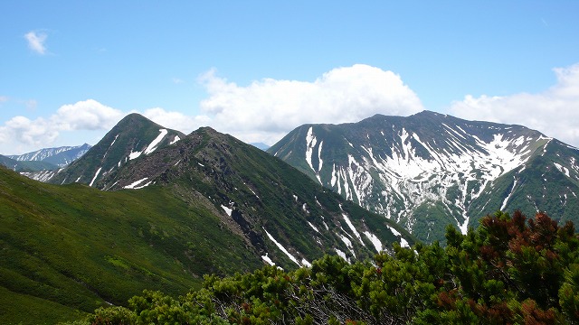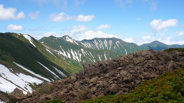 戸蔦別岳(左奥)〜1881峰〜幌尻岳と北カール (ヌカビラ岳から)