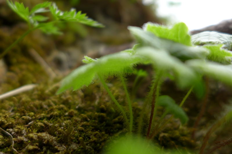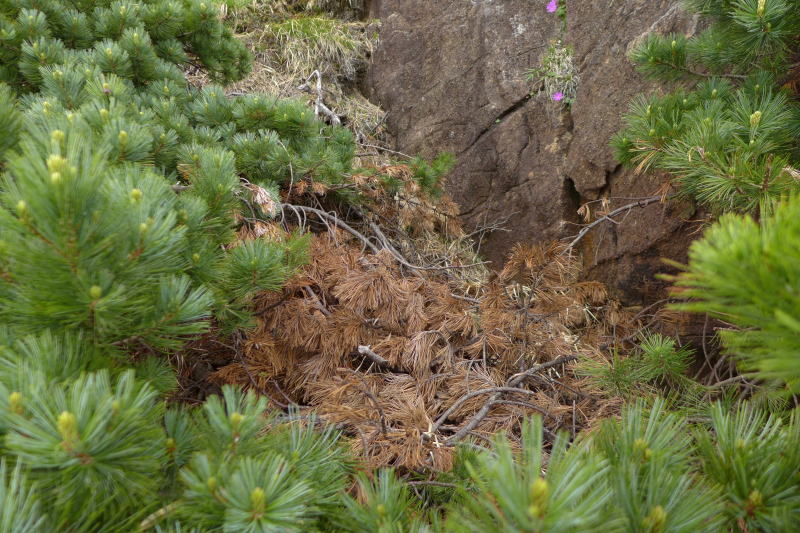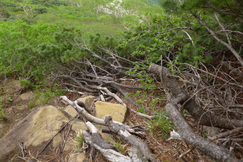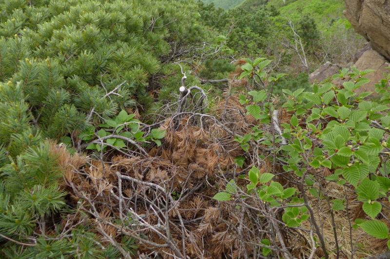 B カムイコザクラが咲く橄欖岩の基部を始めとした大量のハイマツの伐採と茶変したこれら枝葉