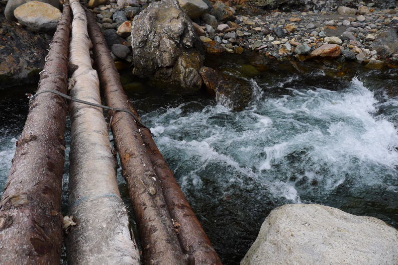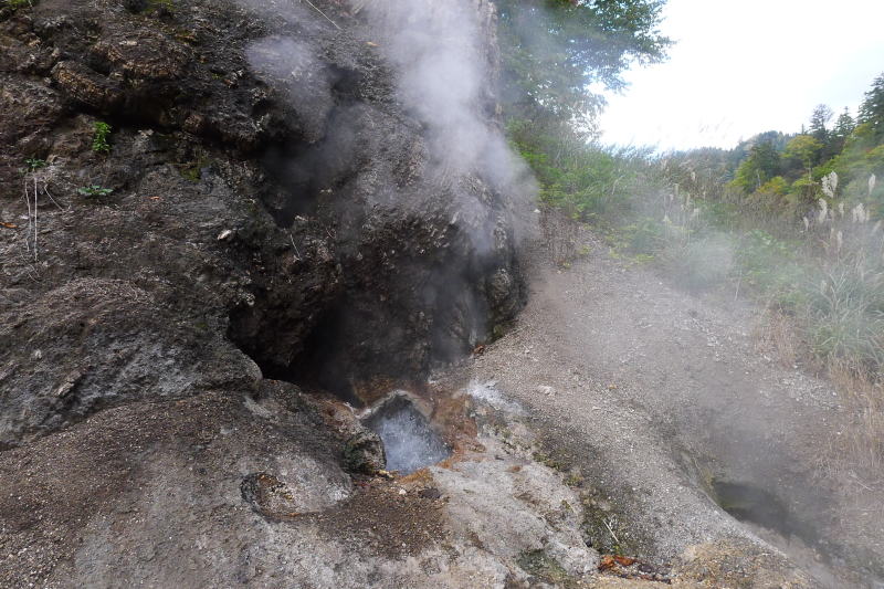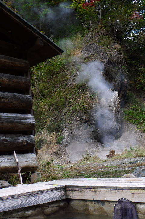 ヌンプ小屋から少し先に進んで、ヌンプトムラウシ川に掛けられた丸太の架け橋を渡ると、すぐ先に脱衣場が見える。脱衣場の左手、尾根の末端に噴気孔があって、熱湯がじゃぶじゃぶ湧き出している。