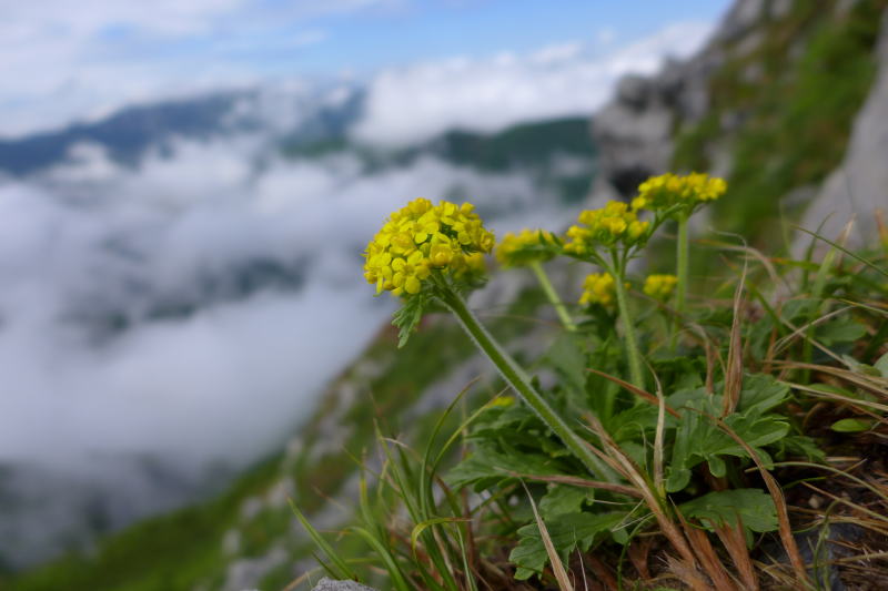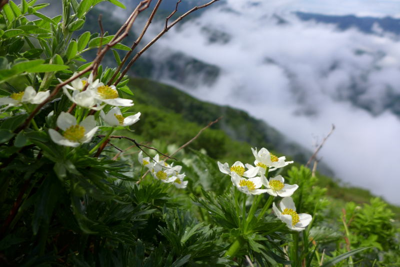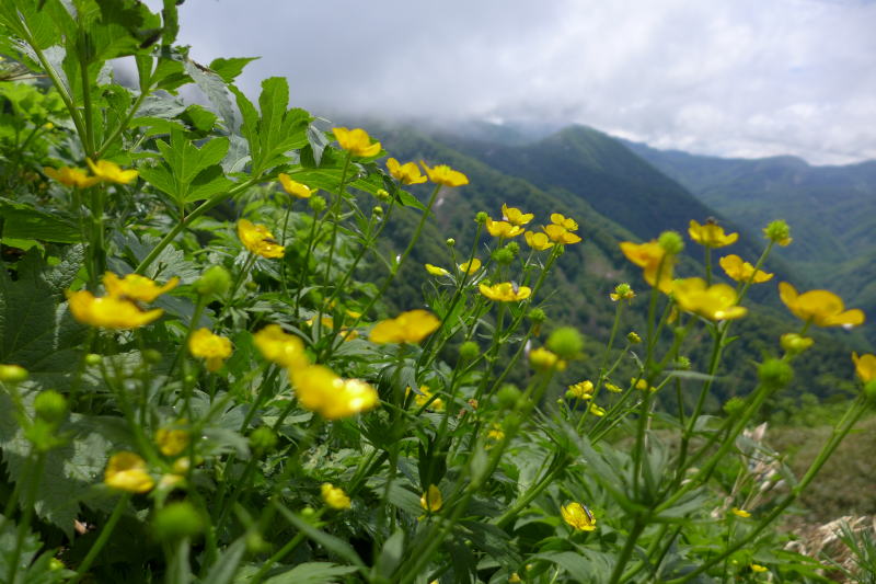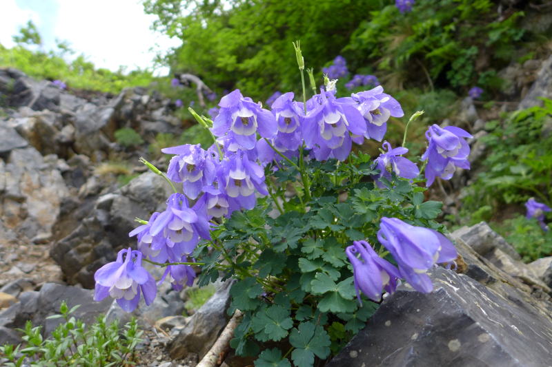 さらに歩みを進めると、石灰岩が露出した1109mの中腹となり、ミヤマオダマキ、ミヤマアズマギク、オオヒラタンポポ、チシマキンレイカ、エゾノハクサンイチゲ、ミヤマハンショウズルなどのオンパレードとなる。ミヤマアズマギクが少し花期を過ぎているものの、そのほかの花はまさに最盛期である。