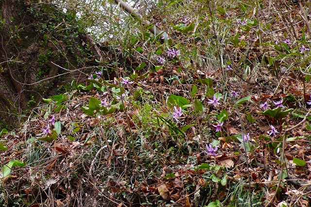 トンネルをくぐったすぐ右手下の小川に沿った崖に着く葉が気になるがそこはとある施設の敷地脇の斜面で,中央道に接しているが「山」とは言えない。住宅地を山に向かって進むがカタクリが咲くような環境には見えない。しばらく周辺を探すがどうしても匂わないので,気になる「葉」の正体を確かめるため脇の小川に下りると,濁った小川脇の斜面にある葉はカタクリで,大きな木の周辺は太陽の熱を集めていて暖かいのだろう,何株も花を付けている。