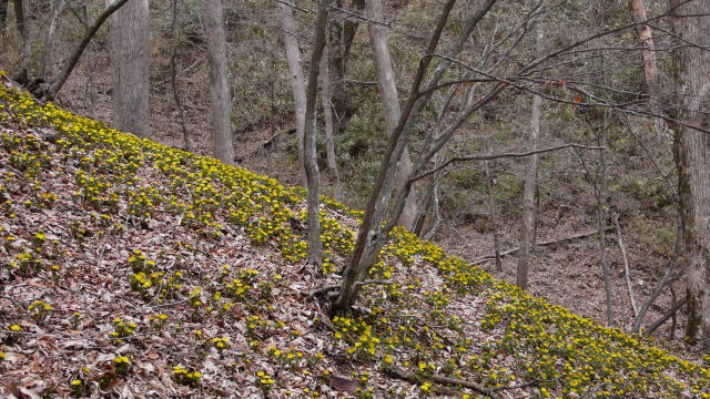 しばらくするとお二人も登ってきて、デジカメでフクジュソウを撮影する。周縁から上部に行き大樹の周りのフクジュソウを写していると、下からおいしそうなお昼ご飯の匂いが上がってくる。あちこち動き回るでもなく、花に囲まれた休憩スペースでの食事は、なんて贅沢な時間の過ごし方なのだろう。こちらとは言えば、用意した簡素なお昼にも手を出さず、写真ばかり・・・なのだ。