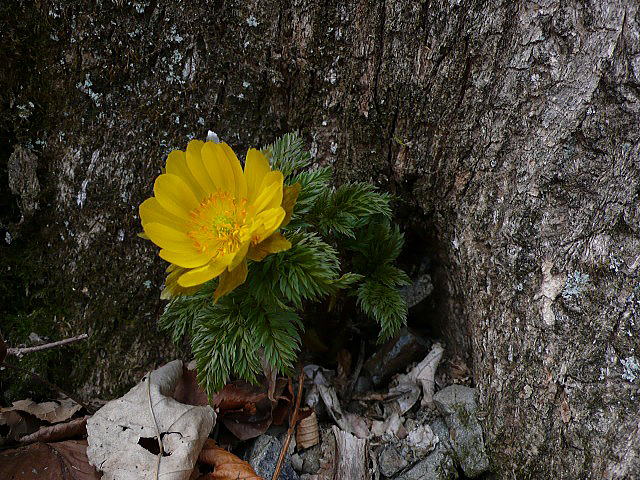 2時間も長逗留をしたフクジュソウ群落地をあとにしていつもの道を戻るが、1か所、花が咲いたら結構素敵な眺めになるだろうと気にかけていた岩の割れ目に着生しているタチツボスミレが、今日は花を広げているだろうかと見てみる。大群落も素晴らしいが、人の目に付きにくいこのような小さなフレームに収まっている花にも心が引き付けられる。