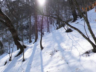 沢に入った途端、「ヘッドランプと予備の食料のない者の入山禁止」との張り紙があり、これによってこの沢が大ドッケに続く沢であることがようやく分かる。沢の流れはほどほどにあるが、岩には氷が張り付いていて滑りやすい。標高は800mを少し切るが、ここから400mほど上がることになる。鹿や小動物の足跡がところどころを横切っているだけで、沢の急斜面の雪を漕いで登るのにエネルギーを要する。