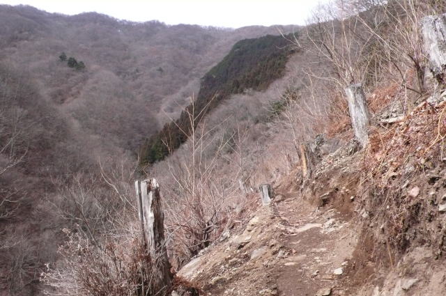 岩場を削った山道から伐採跡が見える。その斜面を数人が進んでいる。今年は、鹿の食害から植林を守る工事が奥まで入っていて、ザレた斜面もきちんと道が切られていて歩きやすい。途中、その道から分かれて少し斜面を下り谷へと下りる。女性4人のグループが沢に入ってから沢筋の確認ができず戻ってきた様子だ。行き先を問うと同じなので、(女性グループの採った沢筋で正解なのだが、道が付けられている)いったん斜面を登って沢をまたぐコースを案内する。工事用の赤いテープが何か所か沢に下りたところにあるので間違って沢まで直接下りてしまったようだ。