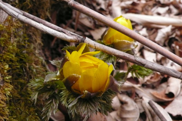 麓の集落を出発して2時間とちょっとで、いつものフクジュソウの花園に着いた。フクジュソウは今日の寒さと曇りがちな天気で花弁を閉じているのが多い。先客は地元の方の男性1人で、小学校か中学校のころに遠足で、もっと標高の低い場所でこのようなフクジュソウの群落に行ったことがあるが、そこがどこだったか思い出せないとのことであった。