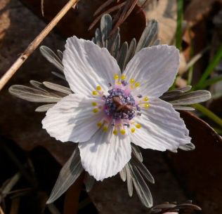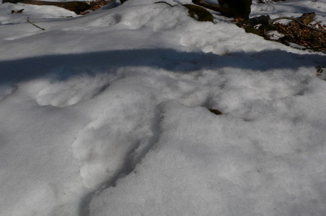そこはまだ雪に覆われているが、鹿がほじくり返したようなところに黄色い花が見えている。もう人が来ているのだなと近づいて雪の上に付けられた足跡を見ると、それは新しい熊の足跡だった。それこそ縦横に付けられている。危険極まりない。それでも花を画像に収めなくてはと、デジカメを取り出す。