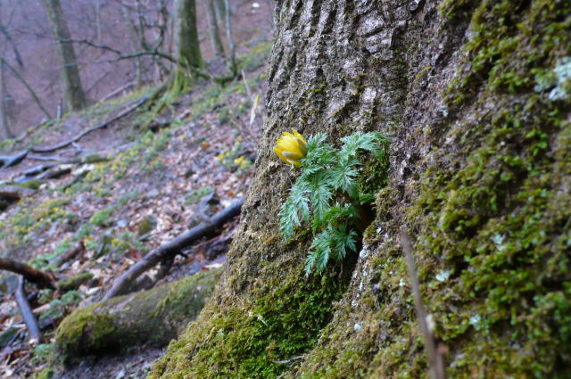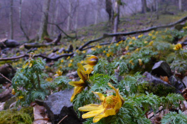 七跳山へ登り、大平山へと向かう。ここは2月に来たときには熊の足跡がたくさんあったところだ。日高の山で使う特大の熊鈴を鳴らして進む。大クビレで天目山林道を交わり大平山に着く。天気が回復すれば秘密の花園にいったん下ってから稜線に戻り、峠ノ尾根を細久保集落に出るつもりだ。1340m付近から秘密の花園へ向け滑り落ちるように下る。秘密の花園のフクジュソウたちはもう間もなく花期を終えようとしている。相変わらず雨が降っているが、どうにか数枚を撮る。たかが200m弱の下っただけ、また稜線に出ようと斜面を見上げる。しかし、もう登り返す気力が湧かない。