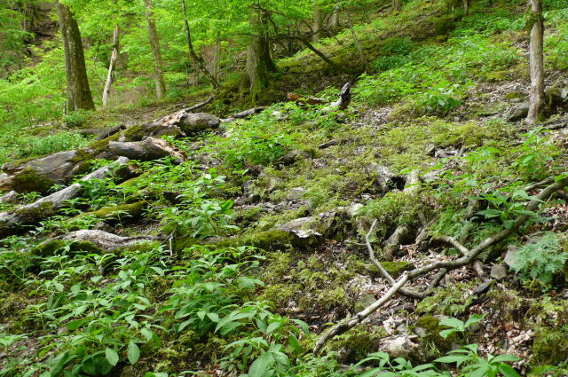 これまで気になっていたフクジュソウの群落地及び群落地までの場所での植生は分かった。今夜の宿を求めて、笹薮を漕ぎ稜線に上がり、ツキノワグマを心配して大平山から七跳山を越え、酉谷山まで行かなくては・・・。もう時刻は午後2時を大きく過ぎた。ゆっくり出発した付けが回ってきた。先を急がなければならない。