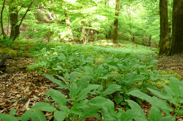 これといった花を見ることなくフクジュソウの群落地に着く。もうフクジュソウは葉を茶変させ、実もほとんど残っていない。唯一、ハシリドコロだけが威勢がいい。