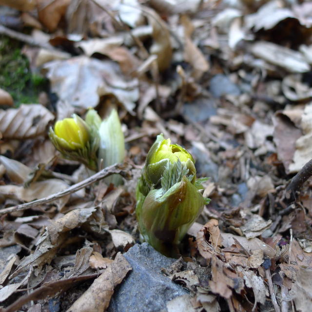 間もなく秘密の花園と言うところで、雪の上にツキノワグマの新しい足跡がある。さらに標高を上げると花園だが遠くからは一面が茶褐色に見える。花園の地面はカチンカチンに凍っている。芽吹いているフクジュソウはない。あそこまで登ったらどうだろうかと、目星を付けて行くと落ち葉の中に黄色い蕾が見える。陽が差し込んでいるのに気温は3度しかない。それなのにもう芽吹いているものがあって、間もなく開花の日を迎えようとしている。