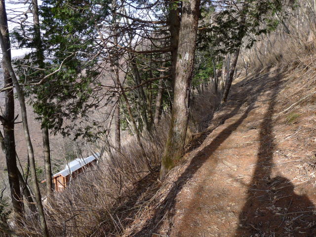 若者たちが去ったので、小屋の窓や扉を全開にして土間にたまった土を掃いて外に出します。その後舞いあがった土埃でうっすら汚れたところに雑巾がけをしてから私も出発することにしました。奥多摩のイワウチワやカタクリも見たかったのですが、やはり大ドッケのフクジュソウのその後を見ることにしました。いつものように七跳山から大平山に向かいますが、木々はまだまだ芽吹いておらず、北斜面には雪が残っています。新しい靴跡が一人分ありましたが、これはたぶん昨日のものでしょう。