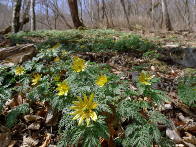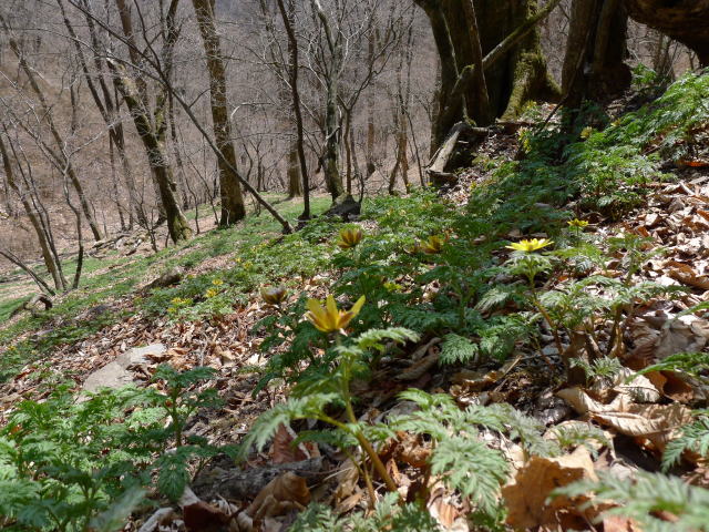 大ネド尾根の分岐点からうるさくなったスズタケの藪を分けて大ドッケのフクジュソウ群落地下降点に向かいます。早くフクジュソウの地へ行こうと尾根から外れて急下降します。だんだんと降りていくと緑が広がってきてフクジュソウ群落地となります。年々勢いのなくなっていくフクジュソウ群落地ですが、それは群落地の真ん中に縦横に入っていく踏み跡のせいもあるでしょうが、踏まれていないところもまばらになっているということは気候も関係しているのかもしれません。