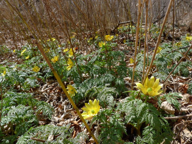 当然ながら4月も中旬となった群落地にフクジュソウの花は多くありません。それでも木陰になったところなどには少し花が残っています。少し写真を撮ってからの群落地を離れ休憩します。気温は20度ほどですがそよそよと吹く風が半袖のスタイルには心地よく、あ〜この場所はいつ来てもいいな〜と思いながら長居をしてしまいました。少ないバスの便のことを考えるとそろそろ腰を上げなければなりません。フクジュソウたちと別れ、伏流となった流れが顔を出すたびに水を飲んで沢を下ります。