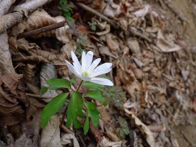 沢の途中まで来ると登ってくる人が目に入ります。声を掛けると地元の人のようです。何度も見に来たようで、その時々の様子を話してもらいました。さらに沢を下っていくと、あれれ〜、この葉っぱはアズマイチゲ?崖が崩れ土砂が流れているところの脇にアズマイチゲの幼苗が固まっています。実はこの地にフクジュソウ以外の花はないかと時期を外してきたことがあるのですが、その時は何も探し出すことはできませんでした。ここにあるということはと、周囲を見渡すと崖の途中に純白の花を付けたアズマイチゲが一輪ありました。このときのうれしさと言ったらありません。たった一輪ですが、そこがまたいいんです。その後、沢から少し上がって斜面を歩くともう1か所でアズマイチゲを見付けましたが、まだ花を咲かすほどの株ではありませんでした。