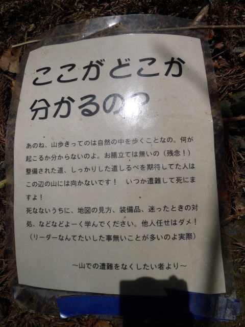 この別な沢野岩の上に「ここがどこか分かるの?」という注意書が置かれていました。実際この沢で迷う人が多いのはよく耳にします。道がよく分からないでこの時間に登っていくということはリスクが大きいから戻るのが正解でしょう。だんだん里が近づいてくるとミツバツツジが咲いています。ここも城山界隈と同じように、近づけるような場所にツツジの木はなく、たった1本登山道脇すぐ下にあったツツジは岩のすき間にしっかりと根を下ろしていたことから、災難を免れたものと思われます。
