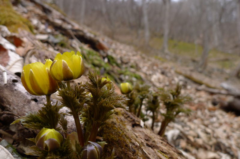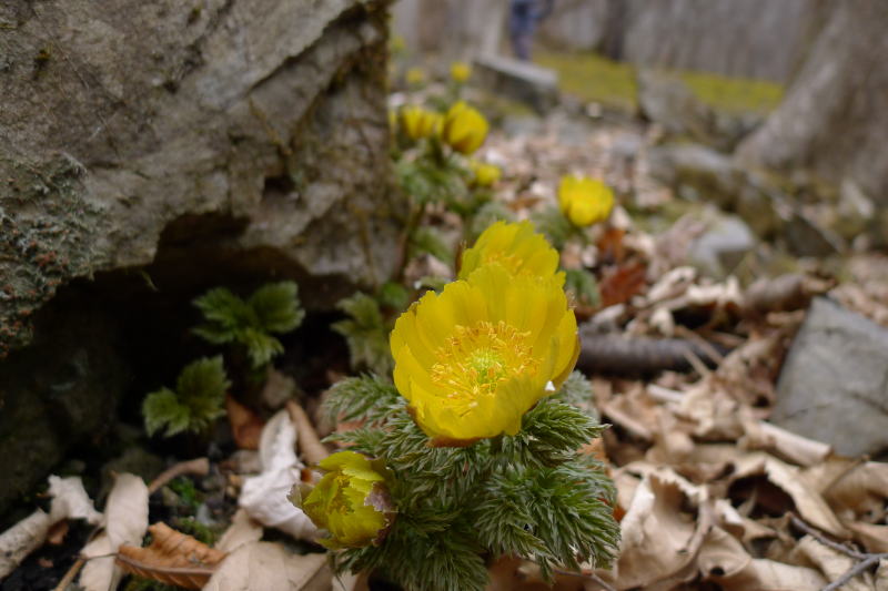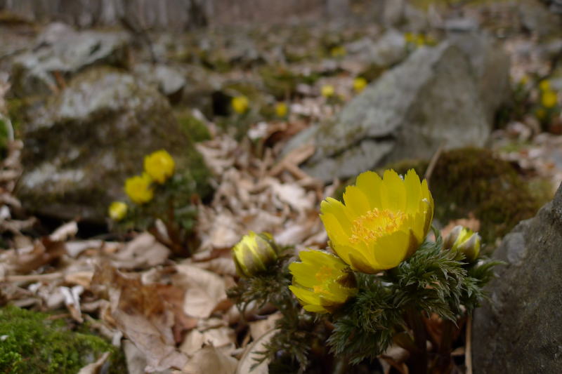 大ドッケのフクジュソウ群落地から浦山大日堂に下り、バスを待つ間に(凍結のおそれがなくなって)最近使えるようになった公衆トイレで着替えます。次の停留所で顔に皺が十分に刻まれた2人の年配のご婦人が乗車してきたので、ご挨拶をします。「今年、フクジュソウを見に行ったのだけれど、途中で帰ってきてしまったんです。」とおっしゃるので、カメラに収めた画像を見ていただきます。「うわぁ、きれ〜い。」と喜んでくれます。「どこまで行かれたのか分かりませんが大変だったでしょう。」と聞くと、「地元の集まりでフクジュソウのところに行く山道の清掃に行ったんですよ。」とのことでした。このような地元の方の理解や思いやりでフクジュソウが今までの長い間あるがままに育まれてきたというのに・・・。ものを言わぬ、思いやりを持たぬ人たちに踏まれながら見られて、今日の花たちは何を思っているのでしょう。