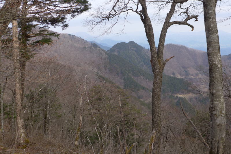 長沢背稜をとことこ歩き七跳山まで登るとようやく体が温まってくる。体調も良くいつもの所要時間より5分短縮で着く。少し大平山寄りに行くと矢岳の尾根がすっきりと見える。ようやく雪が溶けた稜線は芽吹きもなく、土もまだ固い。あれほど咲くヤシオツツジは蕾も膨らんでいない。