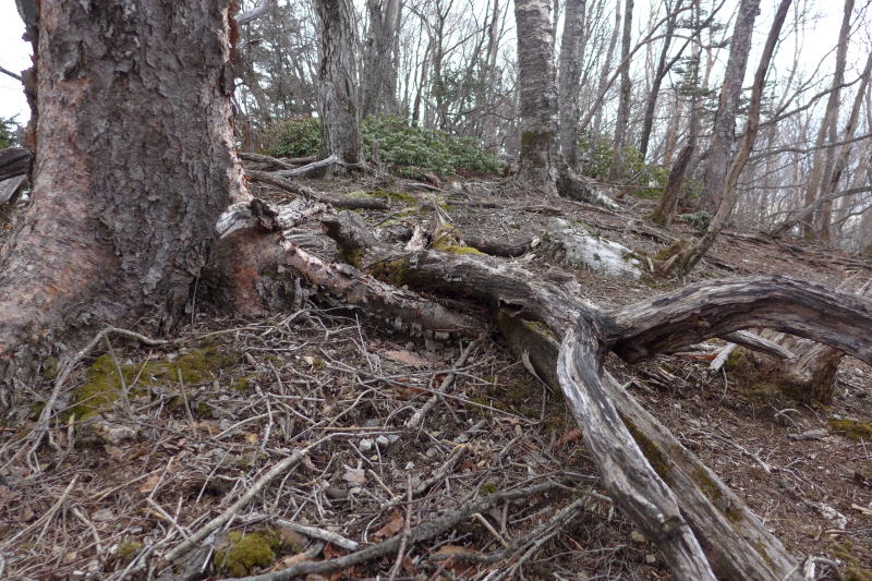 こういうバリエーションルートには、赤や黄色のテープが見苦しいほど付けられているのが常なるも、このコースにはほとんどそのようなものはなく、ごく限られた要所に要領よく付けられているだけで、すっきりしている。だから大平山から少し歩いて大ドッケのフクジュソウ群落地へのダイレクトな下降点を見付けるのは、尾根の斜面を折り切らないところで枯れたスズタケの藪を巻くように付けられた薄い踏み跡を認識することになる。ここはほぼ直滑降でいつもは咲き残りのフクジュソウがあるところの近くに出る。