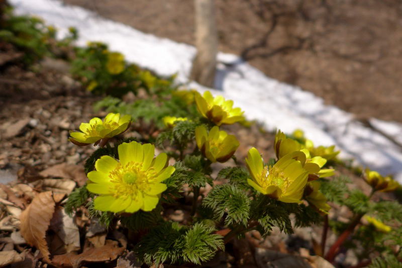 深く積もった雪も木の周辺は融けていてフクジュソウが花を咲かせている。
