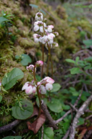 大峠からは胸元までくる笹に登山道が覆われていて余りいい雰囲気ではない。実際、これまでの山歩きで、登山口からしばらく歩いても印象がよくなければ、たいていその日の山はぱっとしたものにならなかったことが多い。高度を上げていくと樹林帯に入るが、コケが生えそうで実は乾燥気味という中途半端なところであった。ここに、イチヨウランが見られるというもののその気配は感じられず、唯一シロバナイチヤクソウがポツリ、ポツリと咲いているところがあった。