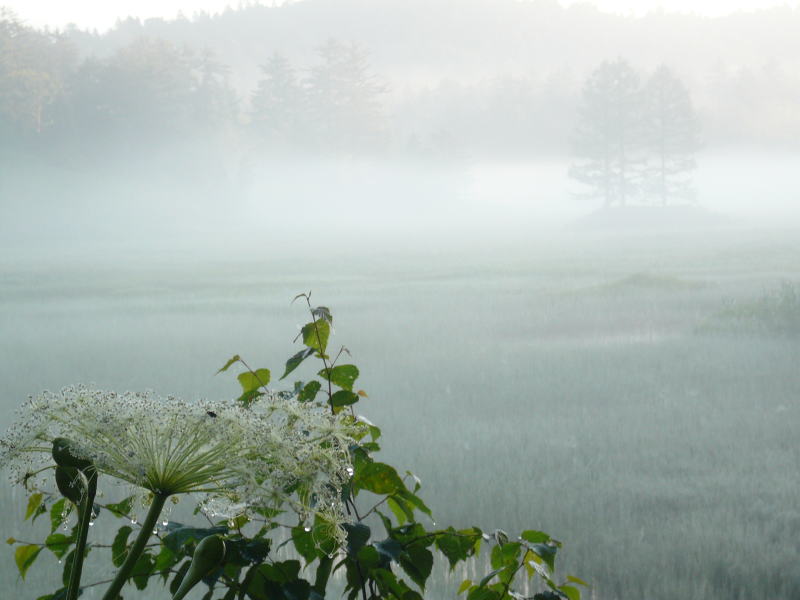 朝もやに包まれた大江湿原