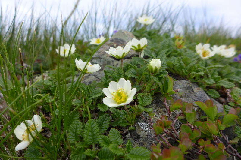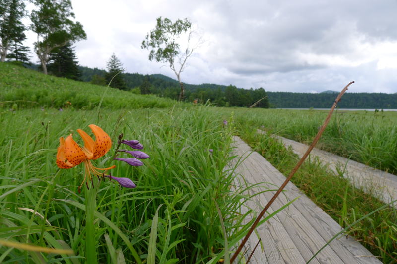 テントサイトには、間隔を空けてウッドデッキが敷設されています。張り綱は石で止め、フライシートはウッドデッキのすき間に溜まった土に刺すために用意した細いチタンのペグで固定して今夜の豪邸が完成です。今宵の豪邸ができたら尾瀬沼ヒュッテのお風呂に入ることができる午後3時30分までは大江湿原への散策に出かけます。途中、ヤナギランの群生があったのでわき道にそれたり、コオニユリやコバギボウシと戯れたりと、思いのほかいい雰囲気の湿原散策でした。