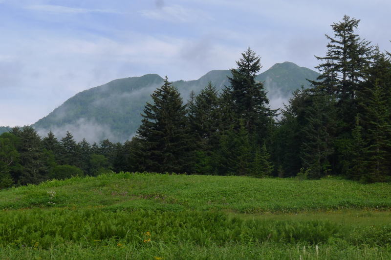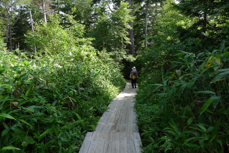夜が明けるにつれ天候はいい方に進み、日差しも出てきました。山の天気は本当に分からないものです。「雷雨」でもいいと250kmも車を走らせてきた根性へのご褒美だったのでしょう。大江湿原のベンチで名残を惜しみ、樹林へと入って行きます。朝早くのシャトルバスで来た人とあいさつを交わしながら進むとあっさりと沼山峠の展望台です。あとは木道を淡々と下りるのみ・・・。