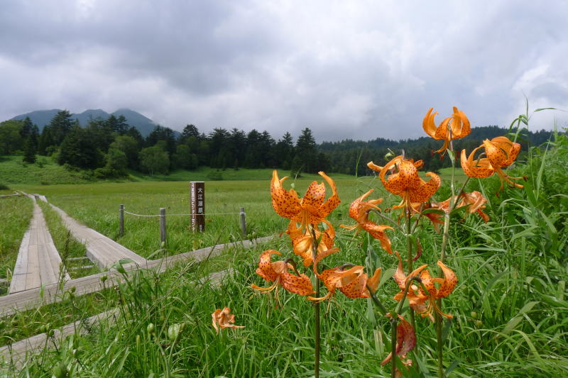 登山口の「山の家沼山峠」からは木道オンリーの平板な登山道です。すぐに沼山峠で、峠の展望台からは尾瀬沼がわずかに見えます。ここから標高を100m下げると大江湿原の入り口になります。そんなところですから、日帰りスタイルの人、子供連れの人などを多く見かけます。森林を抜けて湿原が見えるようになると冷気を伴った大きな風が吹き抜けていきます。うわぁ〜、気持ちいい!