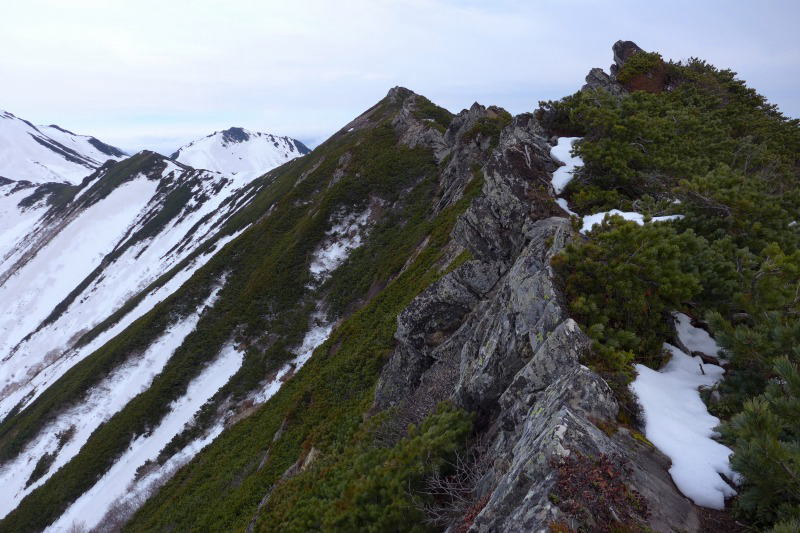 1910m、三ノ沢の水場の探索を諦めて先に進む。雪庇とハイマツが延々と稜線を分けている。雪庇ではまだツボ足でも踏み抜きは少なく快適なものの雪庇が途切れると十勝側は急斜面となっていることからハイマツ帯に逃げなければならない。しかし、夏道がないところはハイマツのブッシュとなっているところが多い。そんなことをしているとき、雪庇に人の足跡を見てホッとしかけたものの、その足跡はとんでもない大きさであろうヒグマのものであった。